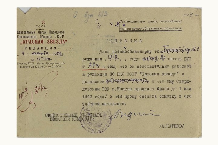 Возможно, поэтому о фотокоре Бернштейне есть только скудная информация о его жизни в период с 1939 по 1942 год. Всего три года из тридцати. И в первую очередь благодаря Константину Симонову, который постарался оставить его след во многих своих послевоенных произведениях и в главном стихотворении «Веселая журналистская», которое стало гимном советских корреспондентов: