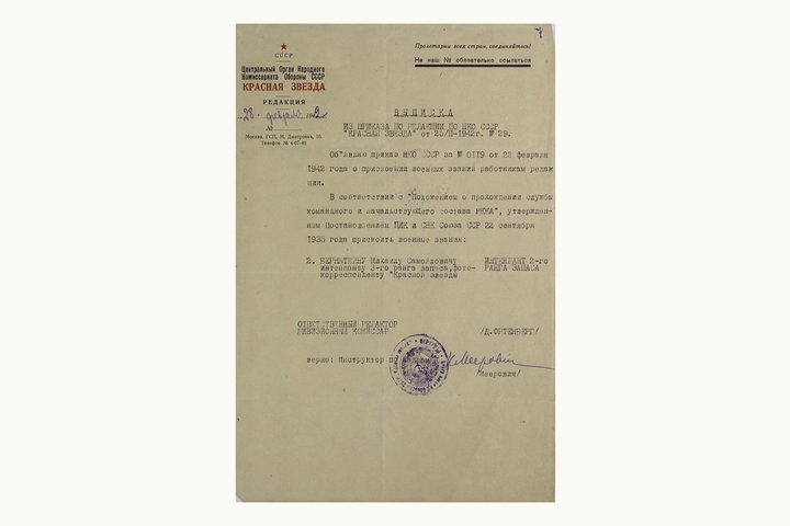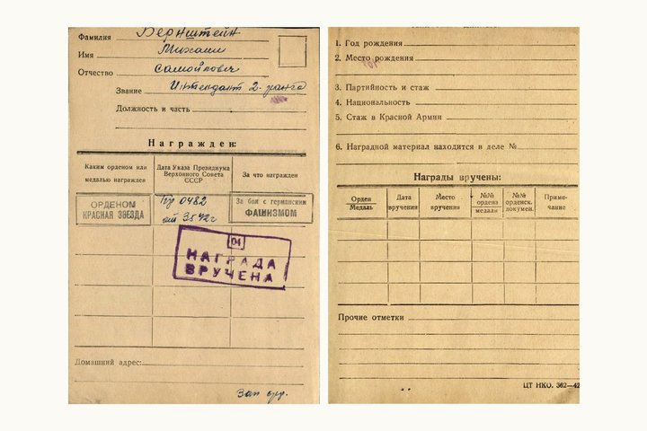 В феврале 1942 года ему было присвоено звание интенданта 2-го ранга запаса. А 3 мая этого же года фотокор был представлен к награде ордена Красной звезды за бои с германским фашизмом. Приказ подписал генерал Георгий Жуков, который еще в 1939 году дал Бернштейну прозвище «вездесущий». Только неизвестно, вручили ему награду или нет. На учетной карточке стоит штамп, что вручили. Дело в том, что в мае 1942 года Михаил Бернштейн числился в списках пропавших без вести сотрудников редакции «Красная звезда».