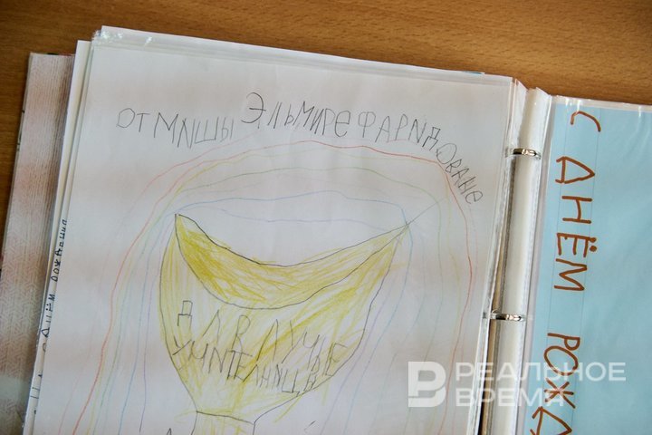Учительница показывает альбом, который в 2017 году сделали ей на день рождения ее первоклашки вместе с родителями: тут и открытки, и добрые пожелания, и рисунки. Это своеобразный ответ на традицию, которую она ввела в своем классе: на день рождения каждого ребенка весь класс рисует для него подарок на листах бумаги, все это собирается в альбом, подписывается и дарится.
