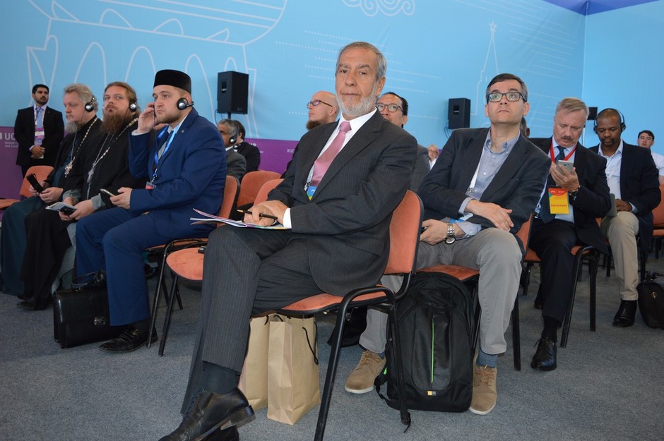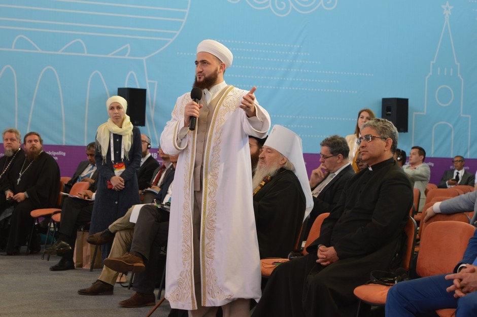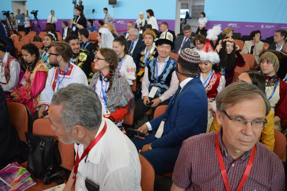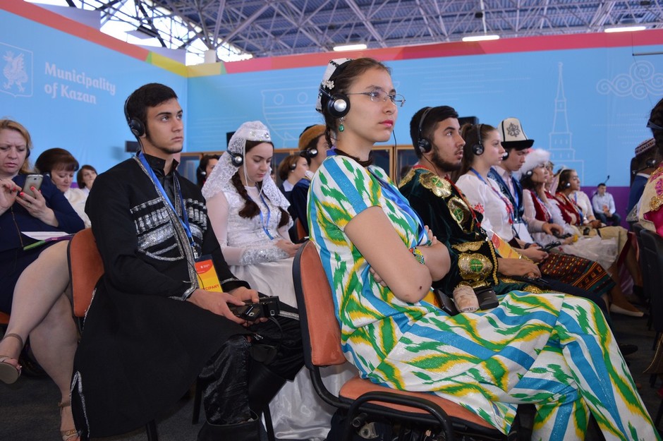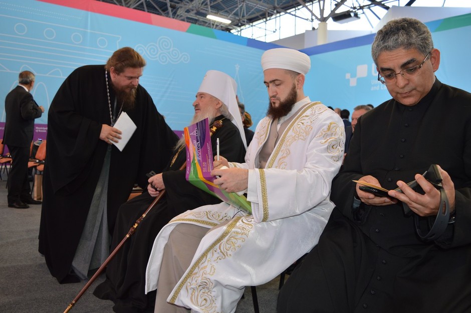 Примечательно, что организаторы подготовились к такому разговору основательно. В зале в несколько рядов сидели парни и девушки из стран СНГ, облаченные в свои национальные костюмы. В перерыве они делали селфи и с удовольствием фотографировались с участниками форума. А на первый ряд усадили главных представителей «мирного сосуществования» — руководителей религиозных общин Татарстана: муфтий Камиль Самигуллин, митрополит Феофан (Ашурков), раввин Ицхак Горелик и католический священник Диогенес Уркиза. Практически каждый докладчик, указывая на них, обратил внимание на такое доброе соседство представителей разных конфессий.