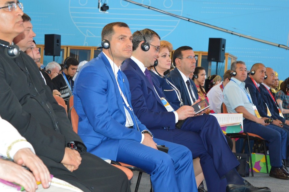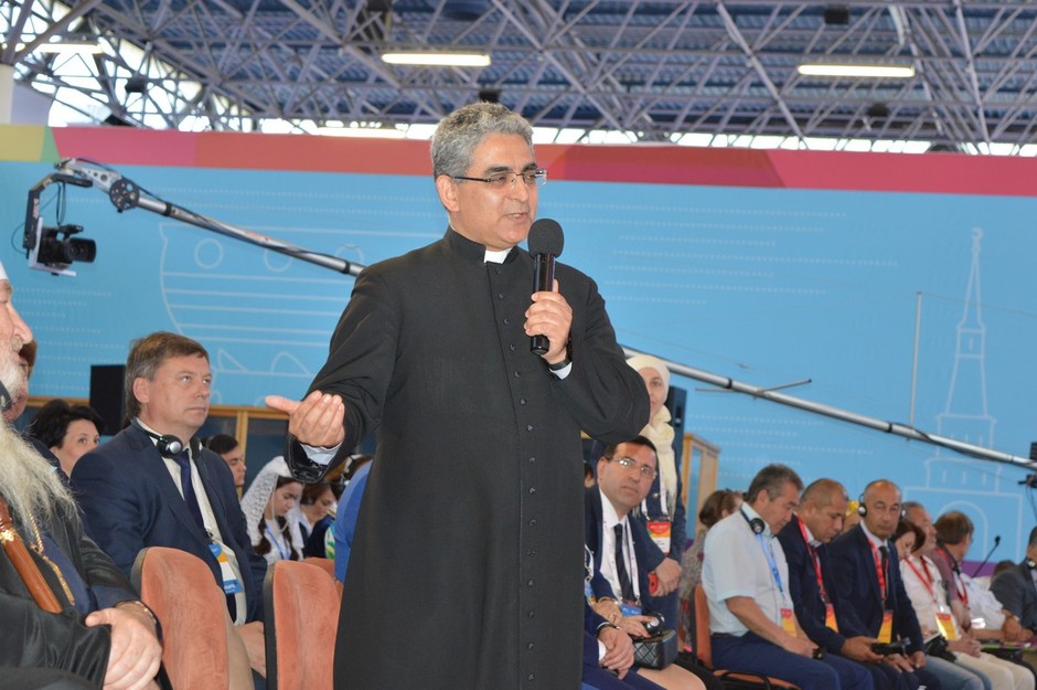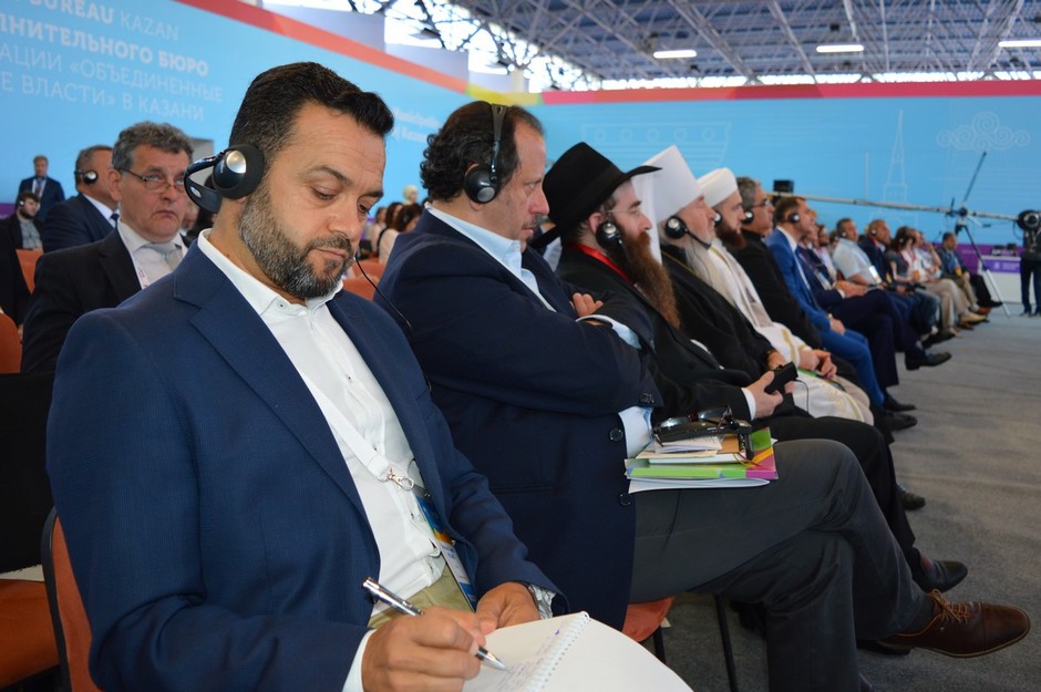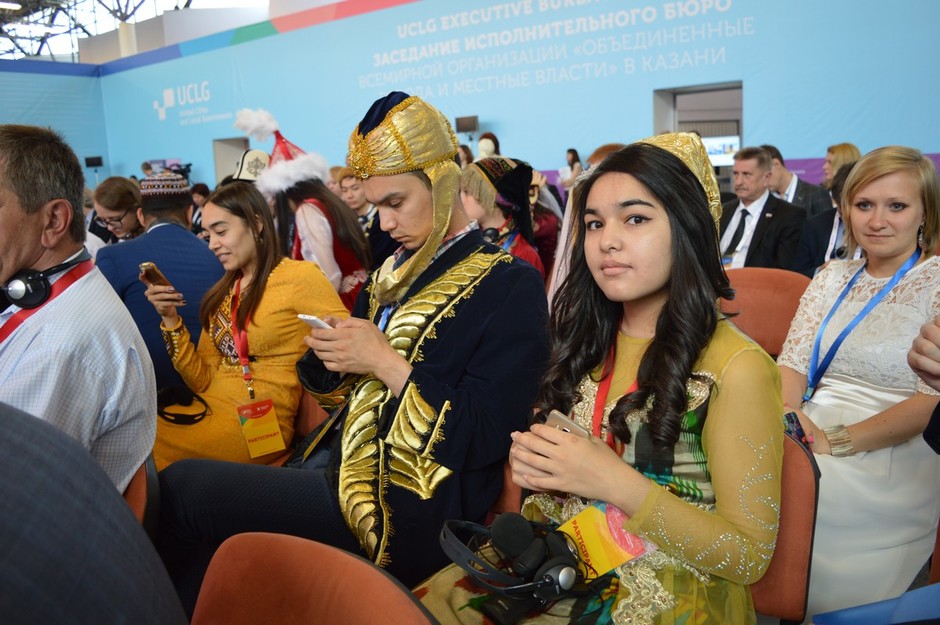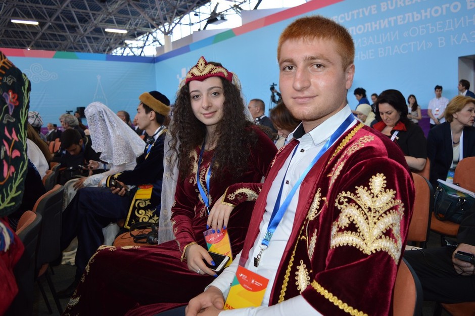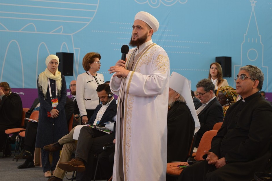 Примечательно, что организаторы подготовились к такому разговору основательно. В зале в несколько рядов сидели парни и девушки из стран СНГ, облаченные в свои национальные костюмы. В перерыве они делали селфи и с удовольствием фотографировались с участниками форума. А на первый ряд усадили главных представителей «мирного сосуществования» — руководителей религиозных общин Татарстана: муфтий Камиль Самигуллин, митрополит Феофан (Ашурков), раввин Ицхак Горелик и католический священник Диогенес Уркиза. Практически каждый докладчик, указывая на них, обратил внимание на такое доброе соседство представителей разных конфессий.