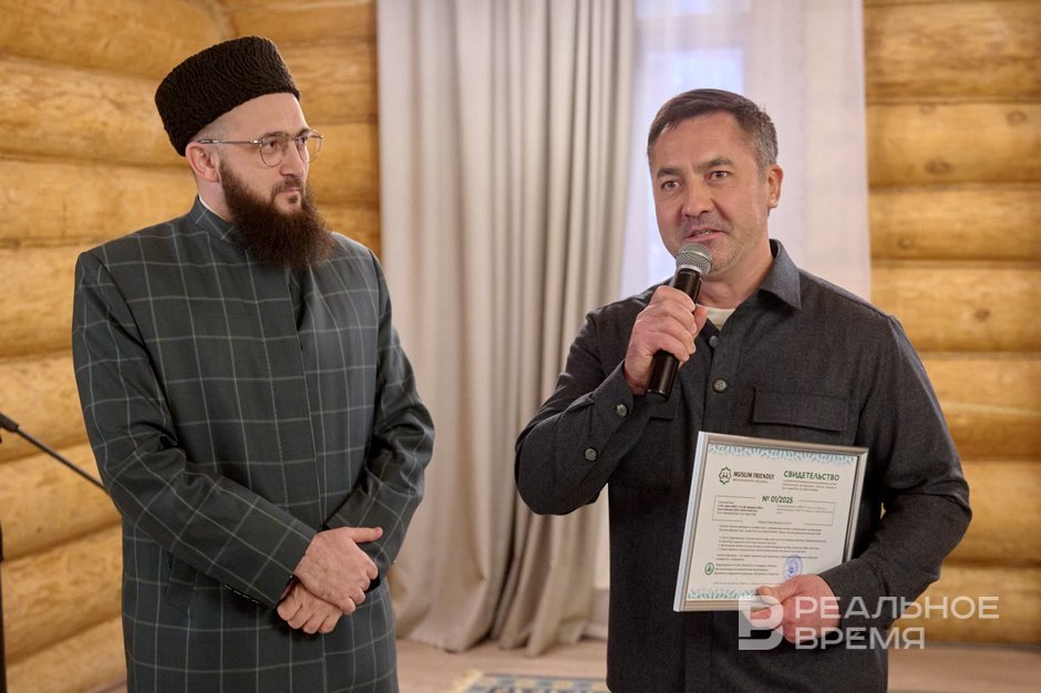 После чего Камиль хазрат рассказал о новинке — сертификате Muslim Friendly, который будут вручать компаниям, создающим условия для комфортного пребывания мусульман (это касается внешнего облика заведения, наличия комнаты для намаза и омовения, отношения к хиджабам, предоставление Корана и так далее). И вручил первый сертификат Радику Абдрахманову, совладельцу «Туган авылым»