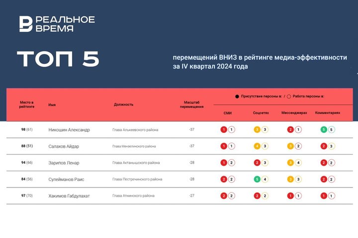 На 37 позиций опустились глава Алькеевского района Александр Никошин (ряд смертельных ДТП, жалобы на уборку снега) и руководитель Мензелинского района Айдар Салахов (рост числа погибших в авариях и слухи в СМИ и соцсетях о предстоящем уходе главы на пенсию).