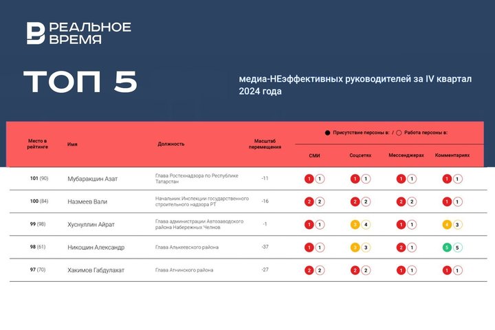 Неэффективную пятерку возглавил глава Приволжского управления Ростехнадзора в Татарстане Азат Мубаракшин. Главным фактором падения стал процесс по «раскулачиванию» его бывшего заместителя Александра Игонова. «Понятно, что в управлении осужденный больше не работает, однако вся эта история уж точно не отражается положительно на имидже управления и его руководителя. Тем более что ни одного комментария по этому делу так и не поступило», — сказали в «Промрейтинге».