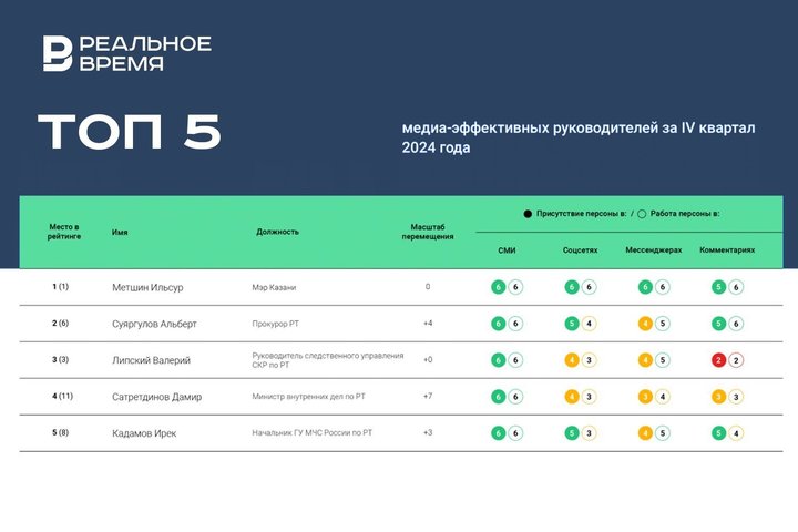 Агентство «ПромРейтинг» опубликовало результаты исследования медиаэффективности руководителей министерств и ведомств, а также глав городов и районов Татарстана за четвертый квартал 2024 года. Впервые за долгое время в топ-5 рейтинга вошли сразу четыре представителя силовых блоков. Лидером остался мэр Казани Ильсур Метшин, который оторвался от ближайшего преследователя почти на 6 тыс. очков. В целом на позиции большинства повлияли новости о ликвидации последствий атаки БПЛА в Казани 21 декабря. Подробнее — в материале «Реального времени».