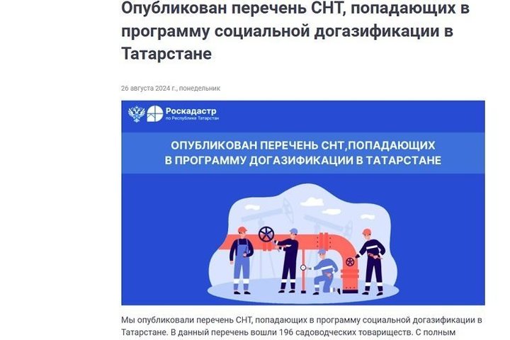 — На сайте Росреестра Татарстана ранее был размещен предварительный перечень СНТ, которые подпадают под условия, которые необходимы для участия в социальной газификации, а именно находятся в границах населенного пункта. Данный перечень был подготовлен, исходя из имеющихся сведений ЕГРН. Однако это не означает, что данные СНТ попали в план-график до газификации, так как это только первое условие программы социальной догазификации. Необходимо соблюсти и ряд других условий… Для получения информации о включении СНТ в план-график догазификации необходимо обратиться в Министерство промышленности и торговли Республики Татарстан. На официальном сайте Управления Росреестра по Республике Татарстан размещены сводный план-график и пообъектный план-график по состоянию на январь 2025 года. Обращаем внимание, что данный план-график не является окончательным, в результате выполнения условий и направления необходимых документов данный план-график может быть пополнен.