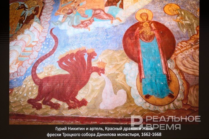 На фоне этих событий появился один из самых уникальных памятников русского апокалиптического искусства — цикл фресок в Троицком соборе Данилова монастыря в Переславле-Залесском. Его расписала артель Гурия Никитина в 1662—1668 годах. «Это уникальный памятник — фреска «Красный дракон и Жена», — сказала Матвеева. Храм был важен для властей. Но главная особенность — масштаб. Обычно сцены Апокалипсиса писали в притворе, в укромных местах. Здесь же он занял всю западную стену и нижние регистры северной и южной стен. Восточную, с алтарем, по канону, не трогали. Фрески изображают 26 эпизодов. Где-то художники шли вглубь, разбирали подробности. Где-то пропускали сцены. Иконографическим источником стала Библия Пискатора. «Фактически это разворачивающийся комикс, посвященный апокалипсису», — отметила спикер.