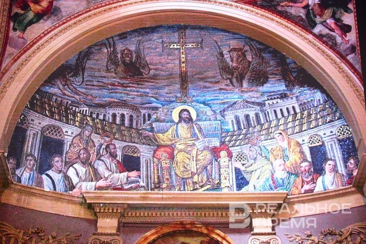 И все же не все в ней складывается. Если пересчитать апостолов, их десять. Это не ошибка художника — скорее следствие истории. «Очень часто эти церкви перестраивались в соответствии с господствующими вкусами, очень часто в эпоху барокко», — объяснила Елена Матвеева. В базиликах, вроде Санта-Мария-ин-Трастевере, можно увидеть «салат» из эпох: потолки барокко, мозаики средневековья, полы косматеско. Так и Санта-Пуденциана. От оригинала остался только рисунок. Но на нем — апостолы и Агнец Апокалипсиса. С ним мозаика становится ключом к прочтению конца времен.
