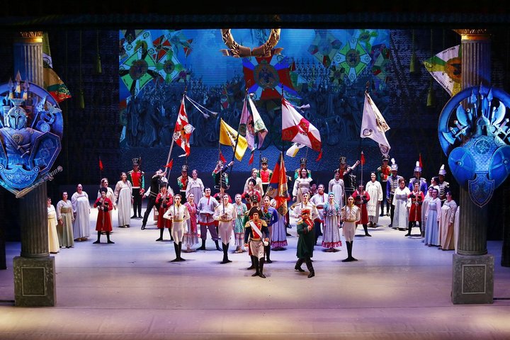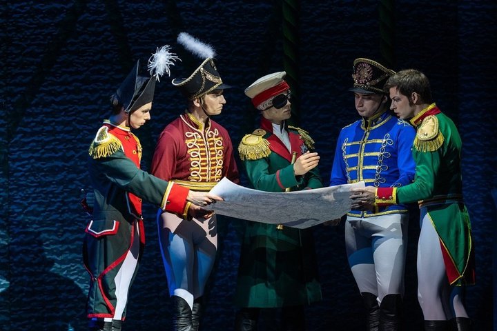 В Казань театр приехал чуть ли не полным составом — в Донецке репетировать скорую премьеру «Королевы чардаша» осталась только оперная труппа. А балет, оркестр, хор, монтажеры, декораторы отправились на гастроли — всего 220 человек. Плюс артисты Марийского балета: восемь пар в сцене салона Анны Шерер, солист труппы Артем Васильев в партии Кутузова, Варвара Морозова и Данил Малов в партиях Коломбины и Арлекина.