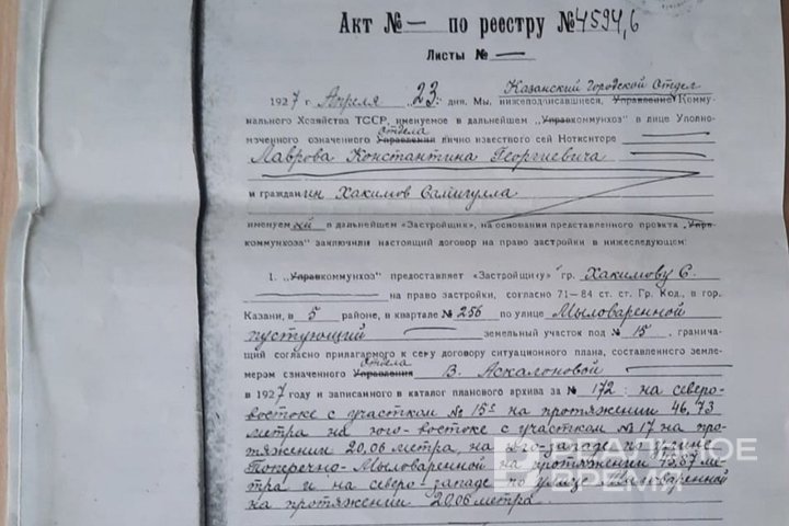 Сарпова рассказала изданию историю этого земельного участка. В 1927 году Казанский городской отдел коммунального хозяйства предоставил Самигулле Хакимову по договору 9,3 сотки пустующей земли на улице Мыловаренной (ныне — ул. Фаткуллина). Земля тогда не передавалась в собственность, а предоставлялась под застройку. Через год, в 1928 году, было заключено дополнительное соглашение к договору застройки, согласно которому право застройки участка предоставлялось уже двум гражданам — Самигулле Хакимову и Шагимардану Шакирову. В итоге оба застройщика возвели на участке отдельные строения — жилые дома с хозяйственными постройками, которые в документах фигурировали как единое домовладение, в котором Хакимову и Шакирову принадлежало по ½ части.