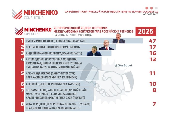 — По итогам интегрированного Индекса плотности международных контактов глав российских регионов за январь — июль 2025 года абсолютным лидером по коммуникации во внешнем контуре является Рустам Минниханов, — заявили исследователи. — Глава Татарстана — безусловный лидер по количеству контактов с международными лидерами, что закрепляет за Миннихановым особый статус главы региона, вовлеченного в мировую повестку.