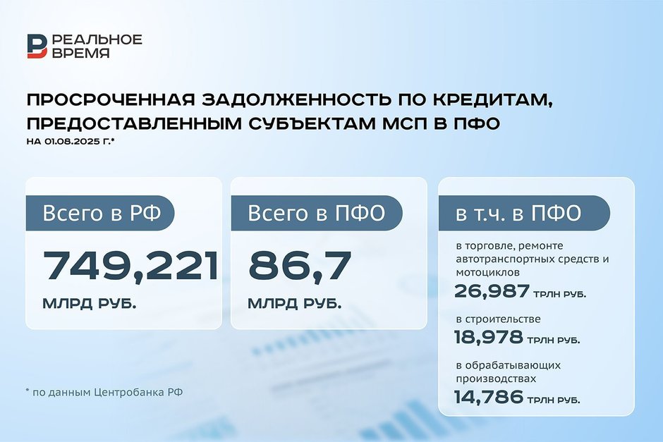 Объемы просроченной задолженности у малого и среднего бизнеса в республике за 7 месяцев 2025 года выросли с 9,25 до 11,95 млрд рублей — на 29,2%, при росте в ПФО и РФ на 17,8 и 13,6%.