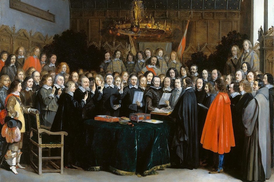 - 1648 — в Мюнстере был заключен Вестфальский мир. Он положил конец Тридцатилетней войне, в которой участвовали католические и протестантские германские княжества. Первых поддерживали Испания, Австрия и Польша, вторых — Франция, Швеция, Дания, Нидерланды, Великобритания и Россия.