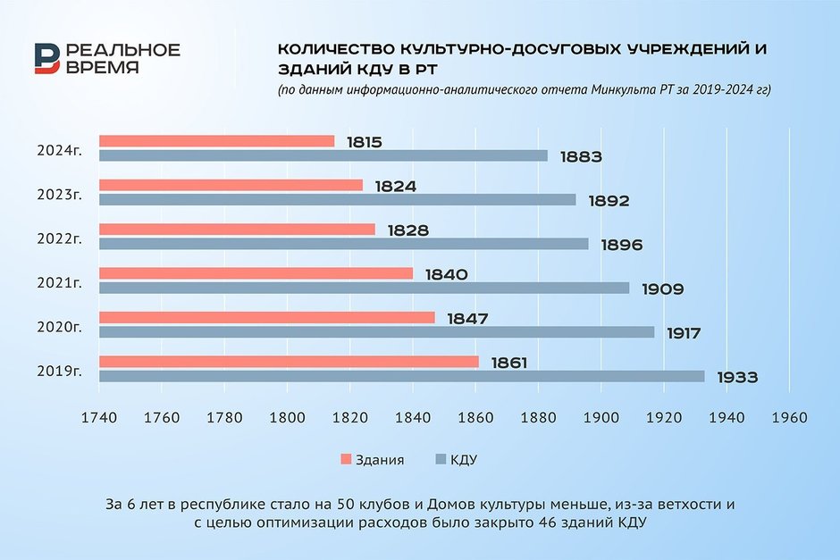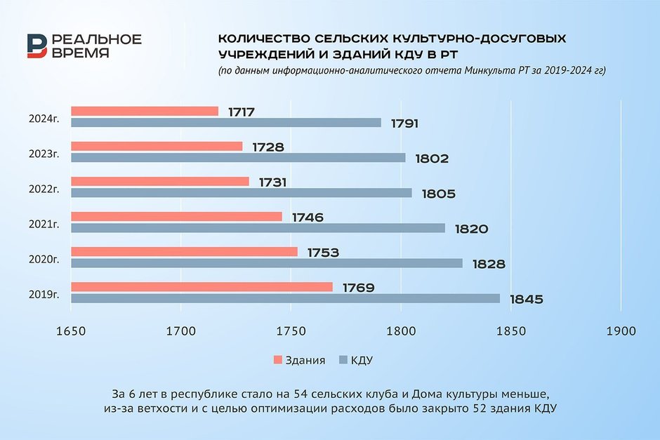 Явный перекос в сторону роста массовости мероприятий, организуемых республиканскими клубно-досуговыми учреждениями, связан с их количеством и «качеством». В отчете приводятся цифры, свидетельствующие о постепенном и планомерном снижении количества ДК и клубов за последние 6 лет. Параллельно уменьшается количество зданий учреждений культуры. Особенно оба этих процесса заметны в селе. При этом доля аварийных и требующих ремонта зданий снижается.