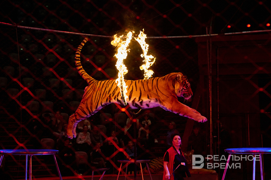 При этом у дрессировщика не так-то много инструментов: есть палка, хлыст. Палка обеспечивает безопасное расстояние до зверя. Но тигр — это не кошка, это хищник, у которого есть полный арсенал когтей, клыков и мощной массы, чтобы догнать добычу, схватить и съесть. Один из способов остановить животное — мощный поток воды из брандспойтов. При этом тигры очень любят мыться, для них даже ставят ванны. И сквозь горящее кольцо они прыгать не боятся, потому что кольцо горит так, что не задевает животного. Задача тренера, чтобы тигр не дотронулся до огня.
