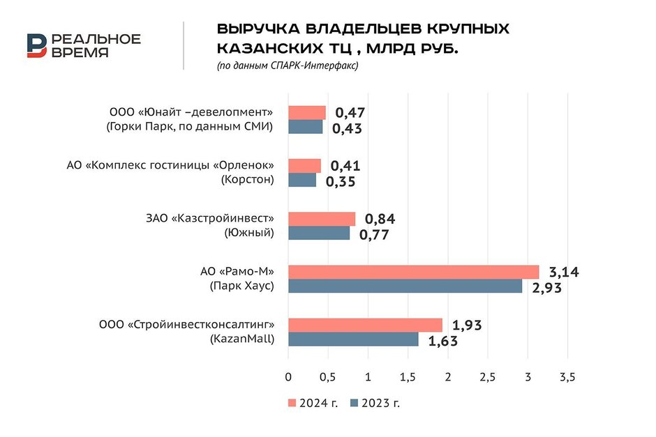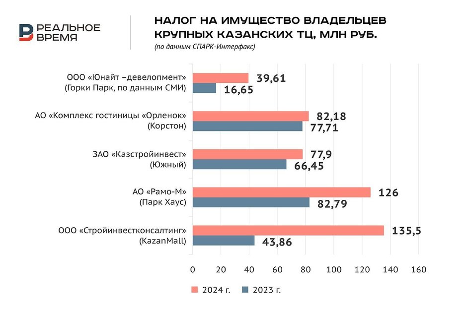 В 2024 году налог на имущество у владельцев крупных казанских ТЦ составил от 4% (АО «Рамо-М», «Парк Хаус») до 20% (АО «Комплекс гостиницы «Орленок» , «Корстон») от выручки.