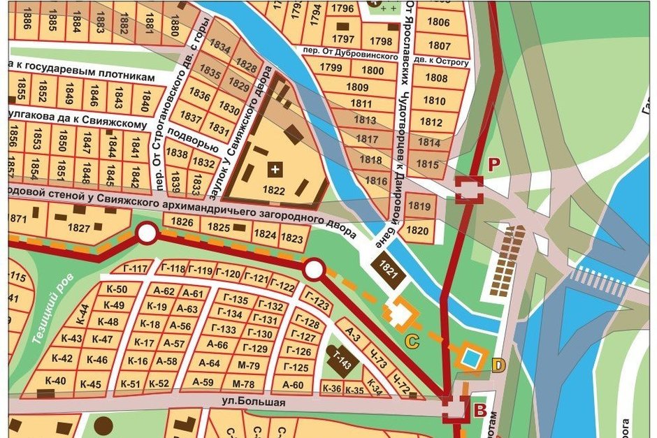 Правее Даировой бани (если смотреть от северного фасада цирка) под крепостной стеной помещался спускавшийся к Гнилому Булаку уже упоминавшийся «двор архимандрита Свияжского Богородицына монастыря на приезд», или, проще говоря, Казанское подворье Свияжской Успенской мужской обители, основанной святителем Германом в 1555 году, одновременно с учреждением Казанской епархии.