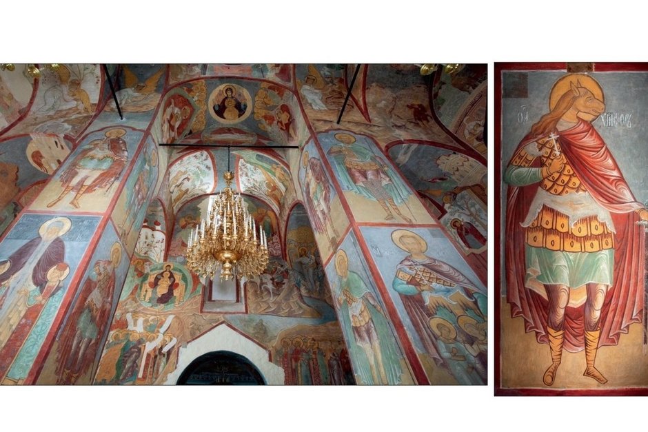 В этой связи очень интересно, что рака с мощами святителя Германа (точнее, «сень» над ракой на четырех столбах, именуемая также «киворием»), поставленная в 1714 году перед левым (глядя от входа) столпом в храмовой части собора, оказалась невольной спасительницей уникальной фрески XVI столетия, изображающей «псеглаца Христофора», древнего святого, почитание которого восходит к римским и греческим мифам о язычниках-людоедах из страны киноцефалов, песьеголовых людей, впоследствии исправившихся и уверовавших в Христа. Так вот, если в XVI—XVII вв. Христофор (то есть «несущий Христа») считался одним из наиболее почитаемых святых, то уже в начале XVIII столетия его изображения с песьей головой, вместе с некоторыми другими «спорными» иконографическими сюжетами, сперва стали «нежелательными» неофициально, а затем и официально: распоряжением Синода от 1722 года они были запрещены как «противные человеческому естеству, истории и самой истине». И быть бы нашему Христофору безжалостно стертым со столпа еще в петровское время, кабы его не закрывала массивная сень над ракой с мощами святителя — о недоступном для глаз изображении опального святого служители храма, конечно же, прекрасно знали (ведь в 1722 году со времени последнего перемещения раки с мощами минуло всего 8 лет), но, очевидно, решили не ворошить прошлое и оставить все как есть.