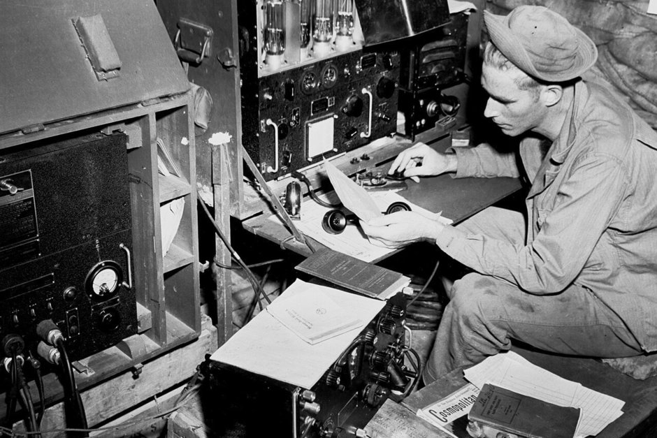 Радист корпуса связи Армии США в 1943 году в Новой Гвинее ведет радиотелеграфную передачу. общественное достояние