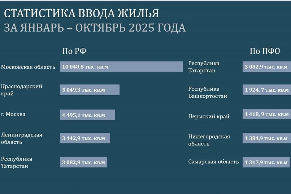 Говоря о вводе жилья в республике, министр подчеркнул, что на 11 ноября в республике ввели 3,334 млн кв. м, а до конца года планируется перешагнуть планку в 3,5 млн. Исходя из данных о вводе жилья в январе — октябре 2025 года, Татарстан оказался пятым в России — его опережали только Московская область, Краснодарский край, Москва и Ленинградская область.