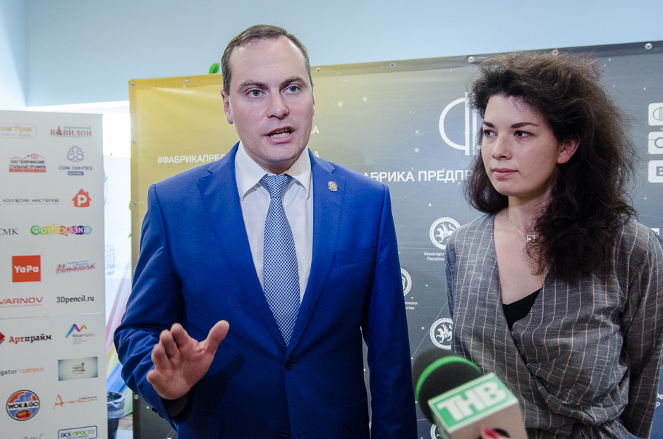 В роли экскурсовода выступил руководитель «Фабрики предпринимательства» Айдар Булатов. Первым делом он подвел группу к стенду альметьевской команды, занимающейся производством мебели и поддонов. По словам Булатова, именно их продукция закупалась при оформлении набережной в Альметьевске. Понятно, что эта информация была адресована Наталии Фишман, в ведении которой и находятся многочисленные парки и скверы Татарстана. Все подобные презентации Фишман выслушала очень внимательно, а некоторыми, к примеру, проектом команды «Ремонтник», производящей спортивные сооружения, даже заинтересовалась.