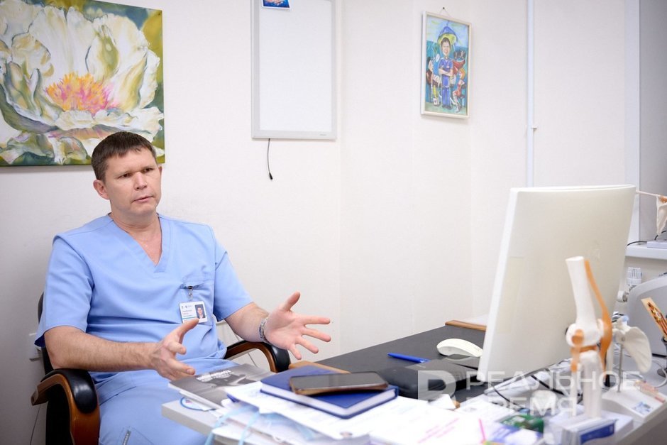 Делают здесь и артроскопию коленного сустава, и эндопротезирование тазобедренных суставов — к примеру, на этом специализируется сам Гамиль Гакильевич (но делает и весь остальной спектр операций в отделении). Как заведующий отделением он выполняет много административной работы, но в операционной бывает практически каждый день, делает одну-две операции. Впрочем, если никак не получается по времени, каждый доктор отделения способен заменить коллегу. Кроме того, и врачи отделения, и заведующий оказывают помощь раненным на СВО бойцам.