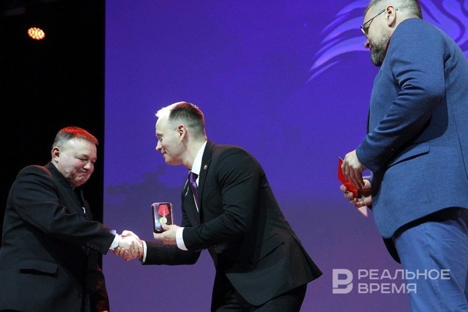 Александр Даренков (справа) поздравляет Фархата Хуснутдинова. Реальное время / realnoevremya.ru