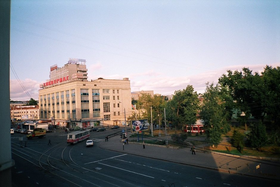 Обратите внимание, что прямо у магазина стоит большой торговый павильон, а в сквере Тукая можно увидеть палатку кафе. В левом углу видны Музуровские номера, которые совсем скоро уступят место ТЦ «Кольцо».