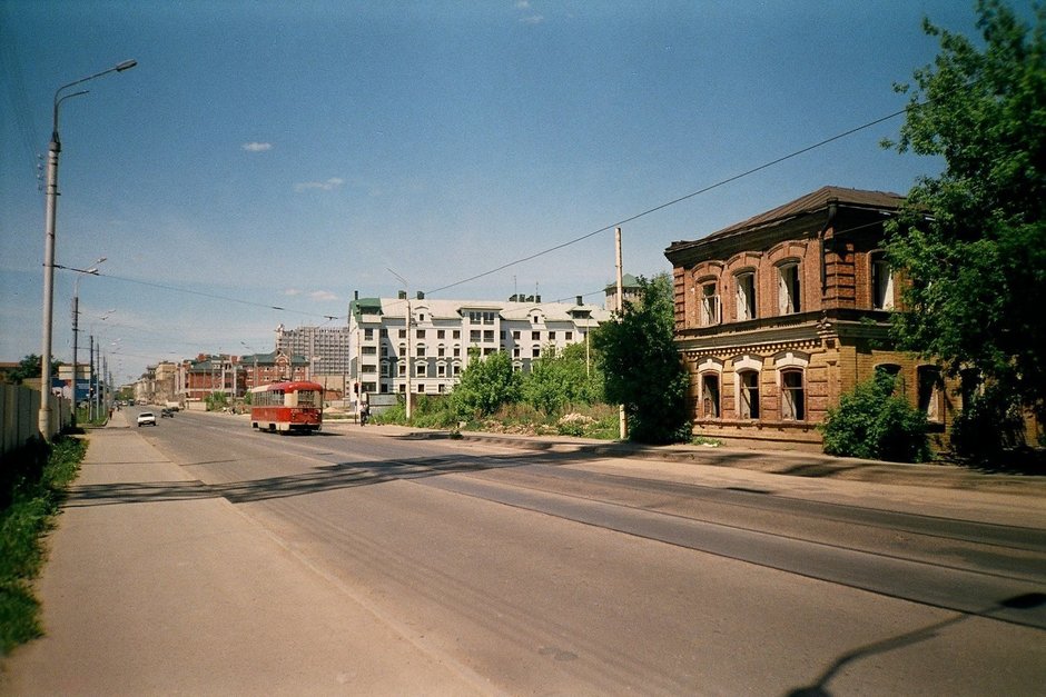 Современную улицу Островского после Пушкина теперь не узнать — в ходе программы ликвидации ветхого жилья ушли в небытие трущобы Дегтярки (они же Пески) с деревянными и полукаменными домами. Они находятся слева, за краем фото, там строят парк Тысячелетия, стройку оградили забором. Видны первые новые дома. Предположим, что фотография сделана у современного Bilyar Palace Hotel. В самом конце виден как раз один из домов Меркулова. А в этих краях находился, к примеру, дом Дрощева из двух— и трехэтажных объемов и дом, где жил химик Гильм Камай.