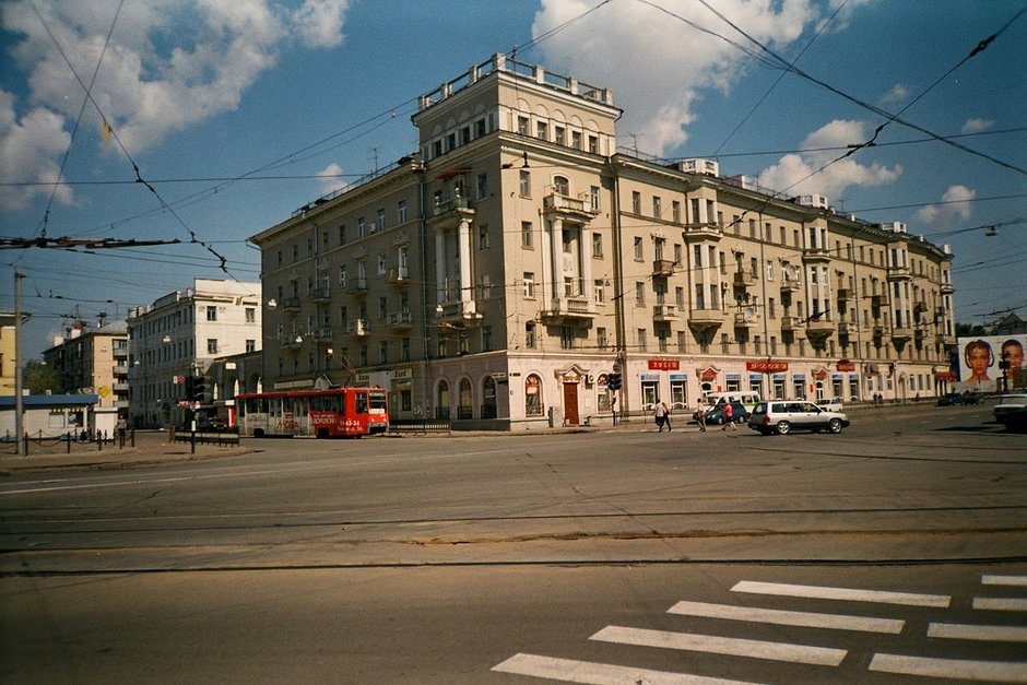 Мы уже на углу Островского и Пушкина. Обратим внимание, что в начале XXI века здесь еще можно было перейти дорогу по пешеходному переходу. Здесь мы видим трамвай, который едет по кольцу через Университетскую — такое же было на улице Каюма Насыри. Уголок площади Тукая справа закрыт гигантским рекламным плакатом — ГУМ открылся 28 августа 2002 года. Заметно, как широко раскинулся ювелирный магазин «Яхонт».
