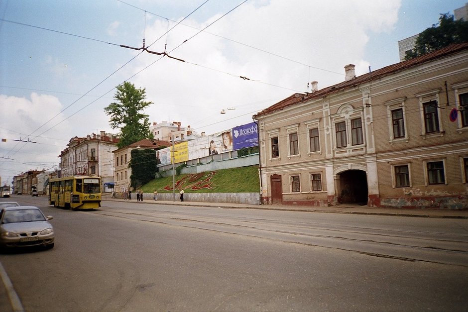 Поднимаемся наверх вместе с 12-м трамваем. Он едет мимо дома 1913 года. Здесь Максим Горький работал в полуподвале крендельщиком, а после размещались «Новые номера» Колесникова. В 2005 году его снесут, а потом построят почти такой же. Следом идет другой тип реконструкции, который на профессиональном жаргоне именуется «фасадизмом»: современное здание как бы состоит из двух частей: фрагмента, стилизованного под старинное строение, и закрытого вент-фасадом нового, там, где располагалась веранда. Исчезли, разумеется, и ворота.