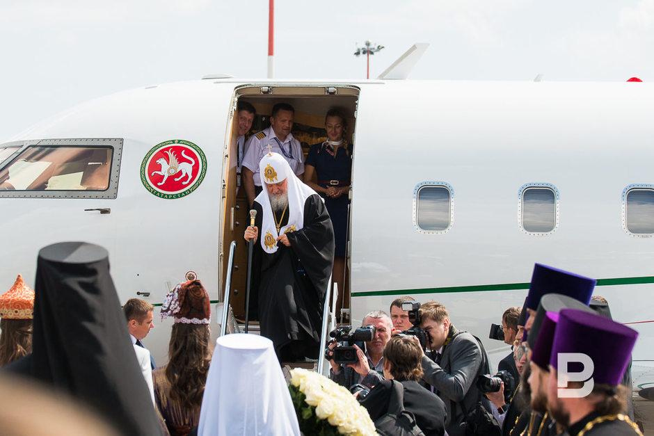 За час до прилета на поле расстелили ковровую дорожку, ковер, прошлись кинологи с собаками, заняли отведенное им место журналисты. Священники выстроились двумя шеренгами параллельно ковровой дорожке. Самолет с Патриархом приземлился точно в назначенный час, у трапа его ждали огромные букеты белых роз и традиционный чак-чак. Глава РПЦ поздоровался с Рустамом Миннихановым и Михаилом Бабичем, с митрополитом Феофаном, священнослужители пропели «Многая лета», и высокий гость подошел к журналистам.