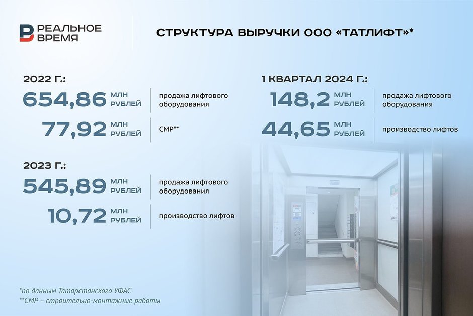 Татарстанское УФАС проанализировало структуру выручки ООО «Татлифт» в 2022—2023 гг и в первом квартале 2024 года. Анализ показал, что непосредственно производством лифтов посредник в поставках между их производителями и поставщиком Фонда ЖКХ начал заниматься в 2023 году, причем доля производства в его выручке до 2024 года была минимальной: