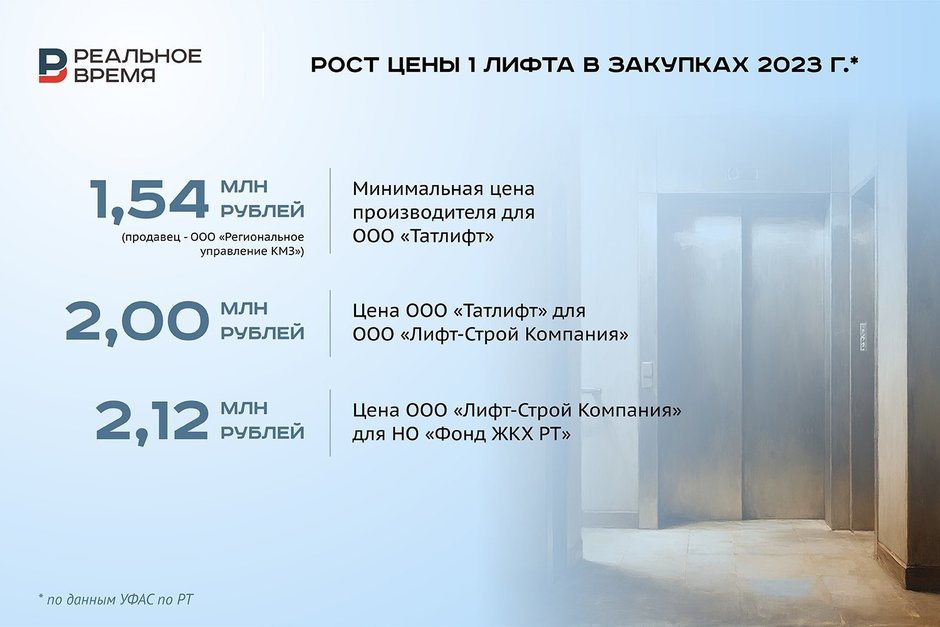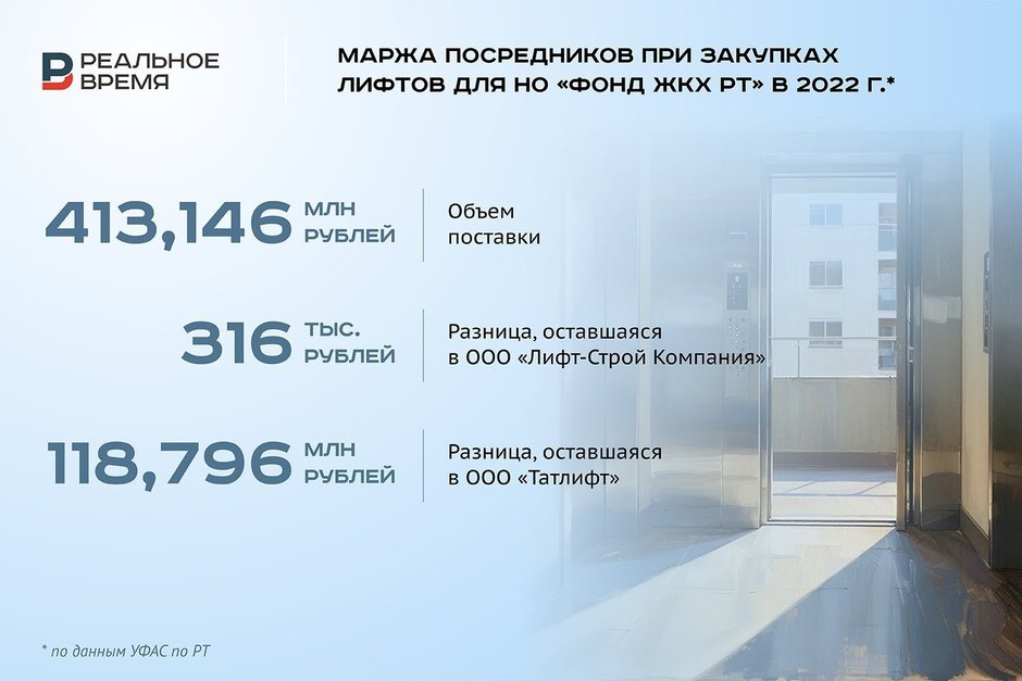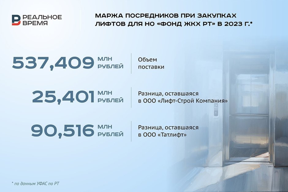 Основанием для возбуждения Татарстанским УФАС антимонопольного дела стали результаты внеплановой проверки, проведенной по требованию Прокуратуры Татарстана. По ее итогам в ведомстве пришли к выводу, что в 2022–2023 гг. в ходе поставок новых лифтов для замены в многоквартирных домах на счетах двух татарстанских компаний осело в общей сложности более 235 млн рублей. При осуществлении закупок подъемников напрямую у производителей на эту сумму по действовавшим тогда ценам можно было бы приобрести еще порядка 159 лифтов, то есть еще треть от того количества, которое было закуплено.