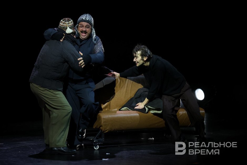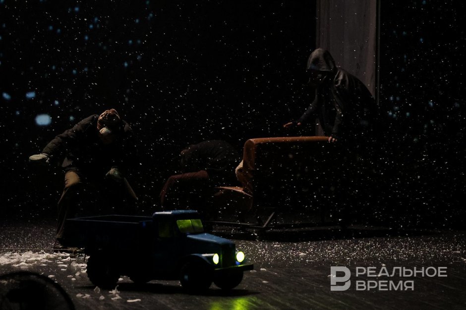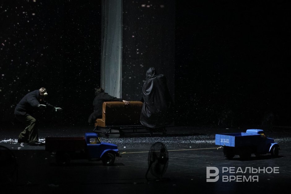 У Заббарова спектакль начинается с их встречи: Ильяс вытягивает заглохшую машину Байтимера. Метель на экранах (основа сценографии), шум, крики. Появляется главный реквизит спектакля: диван, символизирующий салон грузовика. Как шутит один из водителей, ничем они не отличаются от собаки: едят из миски, живут и работают в ящике, да еще и хозяин есть.