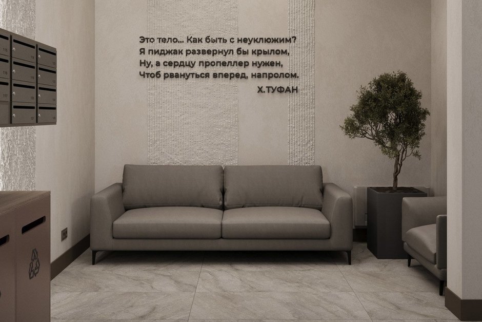 «Между двух эпох» — так звучит концепция «Дома на Туфана». Авторы проекта вдохновлялись творчеством выдающегося татарского поэта XX века Хасана Туфана, чье имя носит улица, на которой расположен дом. Его произведения, вошедшие в золотой фонд татарской поэзии, стали отправной точкой для создания уникального архитектурного облика и атмосферы этого места. Название знакового произведения поэта как нельзя лучше отражает задумку архитекторов и дизайнеров: здесь современная жизнь переплетается с историческим наследием и воспоминаниями, формируя преемственность поколений и уважение к культуре.