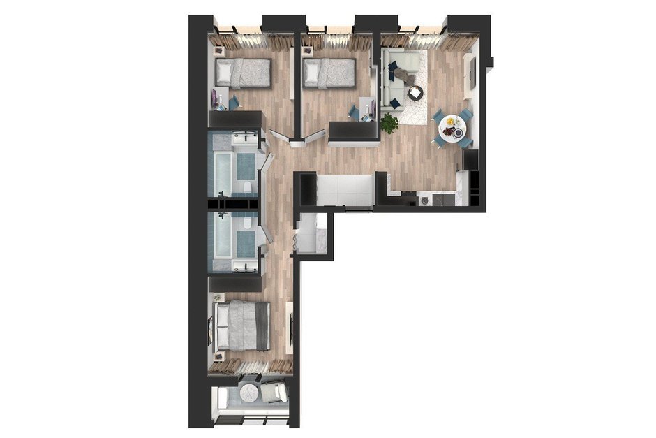 Эта квартира словно создана для большой семьи и ее красивой, насыщенной жизни. Три отдельные комнаты дают каждому личное пространство, а в просторной кухне-гостиной легко представить большой стол, мягкий диван, смех детей и теплые семейные вечера. При желании часть гостиной можно трансформировать в кабинетную зону или даже еще одну спальню. Впрочем, благодаря удачным площадям детских комнат в этом не возникнет необходимости — даже двоим братьям и сестрам будет комфортно вместе.