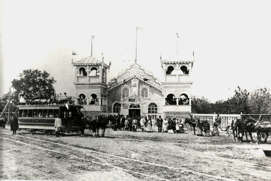 Павильон Второй частной выставки и вагоны конки. взято с сайта commons.wikimedia.org (общественное достояние)