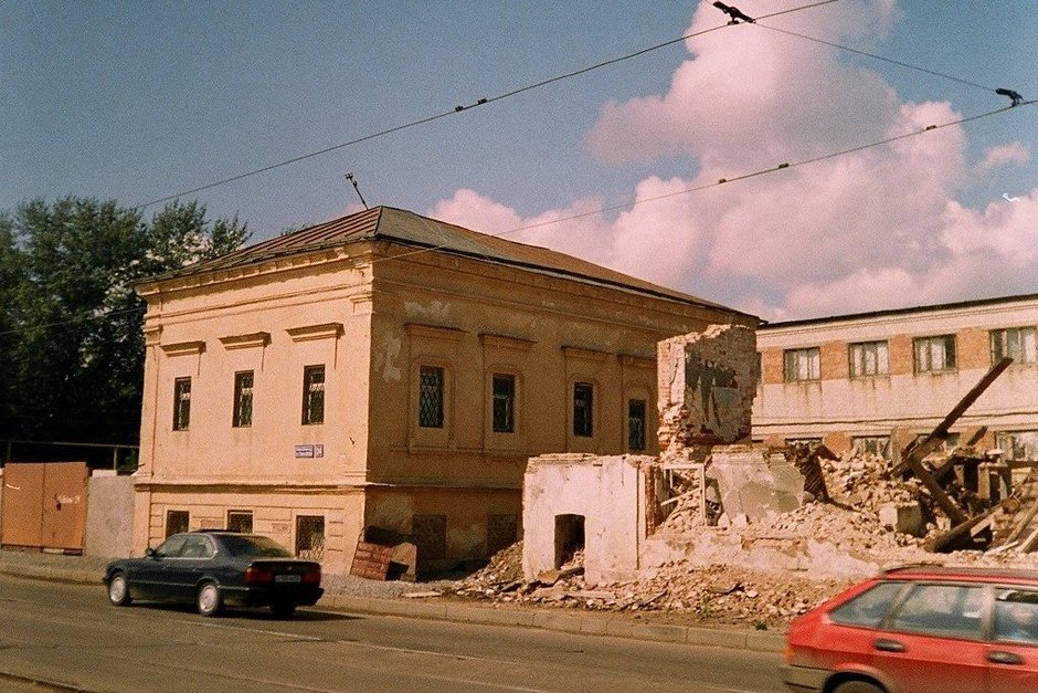На фото же мы видим 24-й дом и процесс сноса дома №22. Сейчас нет уже обоих зданий, на этом месте — небольшая офисная постройка.