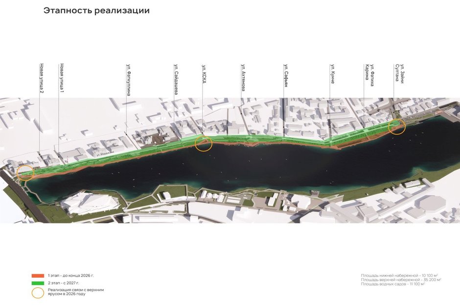 Первый этап стартует уже в этом году. Начнут с нижнего яруса площадью 2,2 гектара. Здесь построят променад с организованными спусками на участках у памятника Марджани, у улиц КСКа и Назарбаева. Появится и смотровая площадка около будущего павильона на улице Кунче.