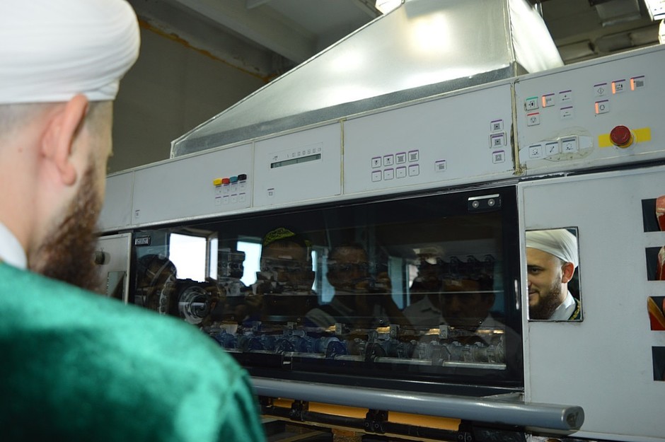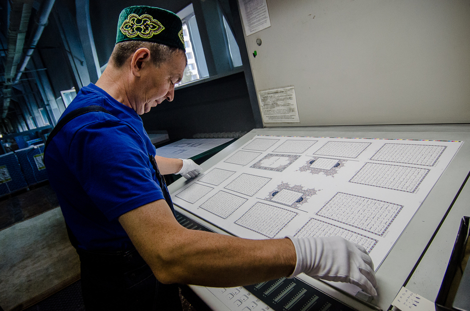 Он обошелся без долгих торжественных речей и перерезания красной ленточки. Вместо этого в цеху издательства «Идел-Пресс», где царила невообразимая жара, была прочитана молитва. После того, как голос начальника отдела по изучению священного Корана ДУМ РТ Ильнура Хайруллина прекратил разноситься по цеху, глава ДУМ РТ Камиль Самигуллин надел белые перчатки и нажал на кнопку пуска печатного станка.