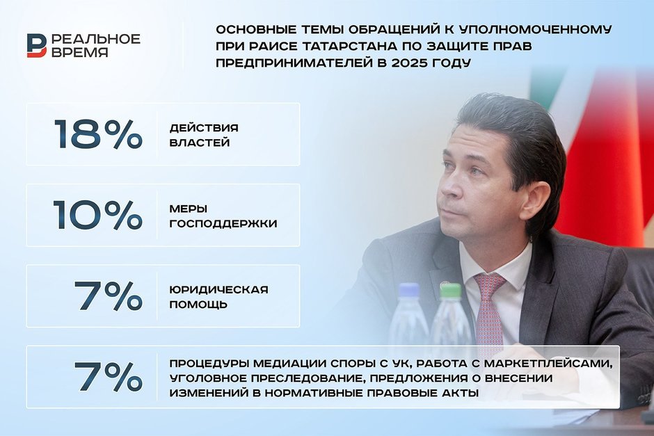 Уполномоченный при раисе Татарстана по защите прав предпринимателей Фарид Абдулганиев сообщил, что за 2025 год к нему поступило 1 265 обращений от предпринимателей — на 23% меньше, чем годом раньше. И в 14 раз меньше, чем в 2020 году, на который пришелся пик жалоб — 17 724.