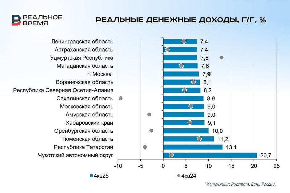 Республику опередил только Чукотский автономный округ, где доходы выросли на 20,7%. Татарстанцы также в тройке лидеров по приросту реальной зарплаты — 10,5%, выше у жителей Ингушетии — 11,3% и Алтая — 12,1%.