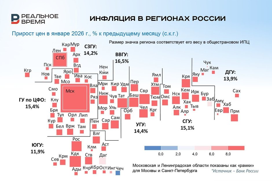 — В январе годовая инфляция выросла до 6,8%, что выше, чем в целом по России. Текущий рост цен также ускорился. Основная причина усиления ценового давления — разовые факторы: повышение НДС, акцизов, регулируемых тарифов и сборов. В среднем за последние 3 месяца цены росли повышенными темпами. Это объясняется январской динамикой, тогда как в ноябре — декабре рост был сдержанным, — сообщили в Волго-Вятском ГУ Банка России, которое обслуживает 11 регионов, включая Татарстан.