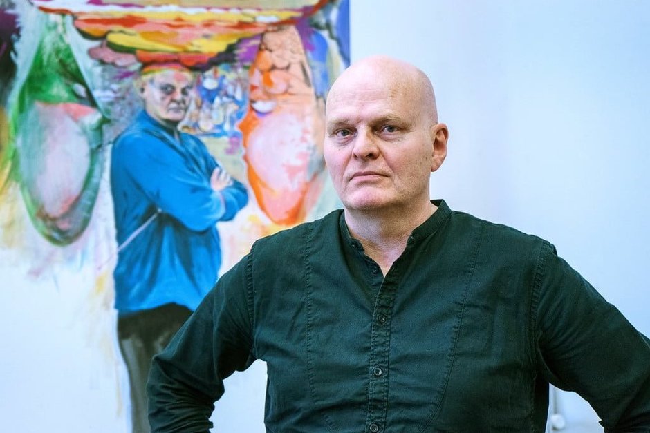 Исландский писатель Хатльгрим Хельгасон на фоне своей работы. скриншот с сайта Mannlif