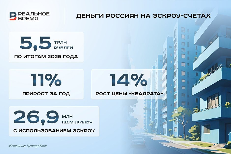 В России по итогам 2025 года сдали 26,9 млн квадратных метров жилья по проектам со счетами эскроу — это на 2% больше, чем годом ранее. Общая сумма средств дольщиков на таких счетах превысила 5,5 трлн рублей или на 11% больше показателей 2024 года. Как объяснили в Центробанке, положительная динамика обусловлена повышением средней цены «квадрата» в новостройках, а также ожиданиями ужесточения условий «Семейной ипотеки».
