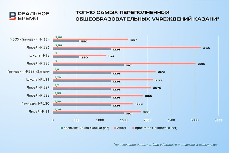 Источник «Реального времени» рассказал, что в лицее №186 два здания (1 224 и 1 501 место) общей проектной мощностью 2 725 мест. В первом полугодии 2025/2026 года в лицее обучалось 2 850 человек. А в гимназии №33 действительно, при проектной мощности 500 человек обучаются 1 587 человек.