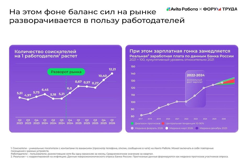 — Мы понимаем, что в последние годы, особенно в 25-м и сейчас в 26-м, экономика нам скорее не помогает. Мы находимся в таком периоде, где у нас такой сложный год, который ставит перед нами сложные вызовы, — начал управляющий директор «Авито Работы» Антон Уваров, говоря о ключевых трендах рынка труда.
