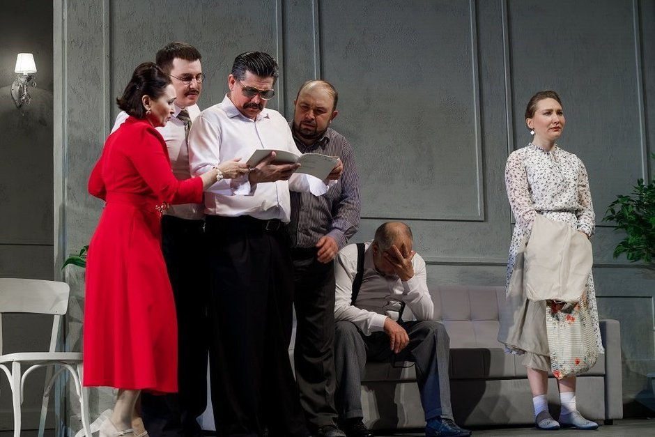 Определить, кто чаще всего будет зачинщицей конфликтов, легко. В красном платье — Гульчачак Хафизова. Далее — Эдуард Никитин, Ирек Хафизов, Алмаз Фатхуллин, Ренат Шамсутдинов и Альбина Гашигуллина. предоставлено пресс-службой театра К.Тинчурина