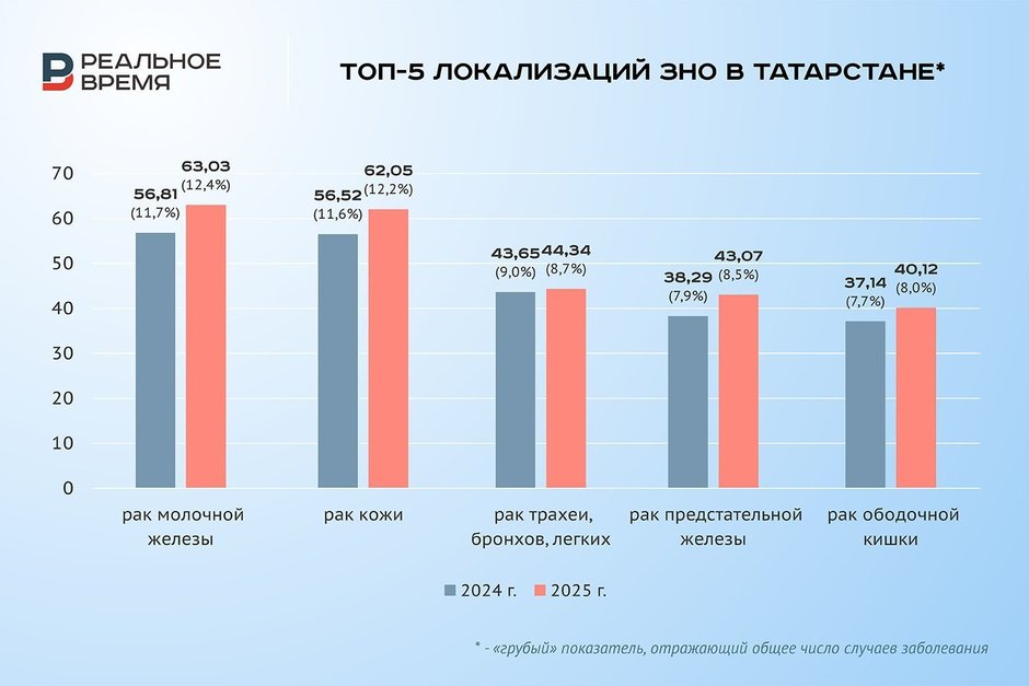 В Татарстане численность больных со злокачественными новообразованиями по итогам 2025 года составила 128 093 человека, это на 806 человек больше, чем в 2024 году. При этом в 2025 году, по сравнению с 2024 годом, количество впервые выявленных случаев ЗНО увеличилось на 4,5% и составило 20 341 случай — на 869 случаев больше, чем годом ранее.